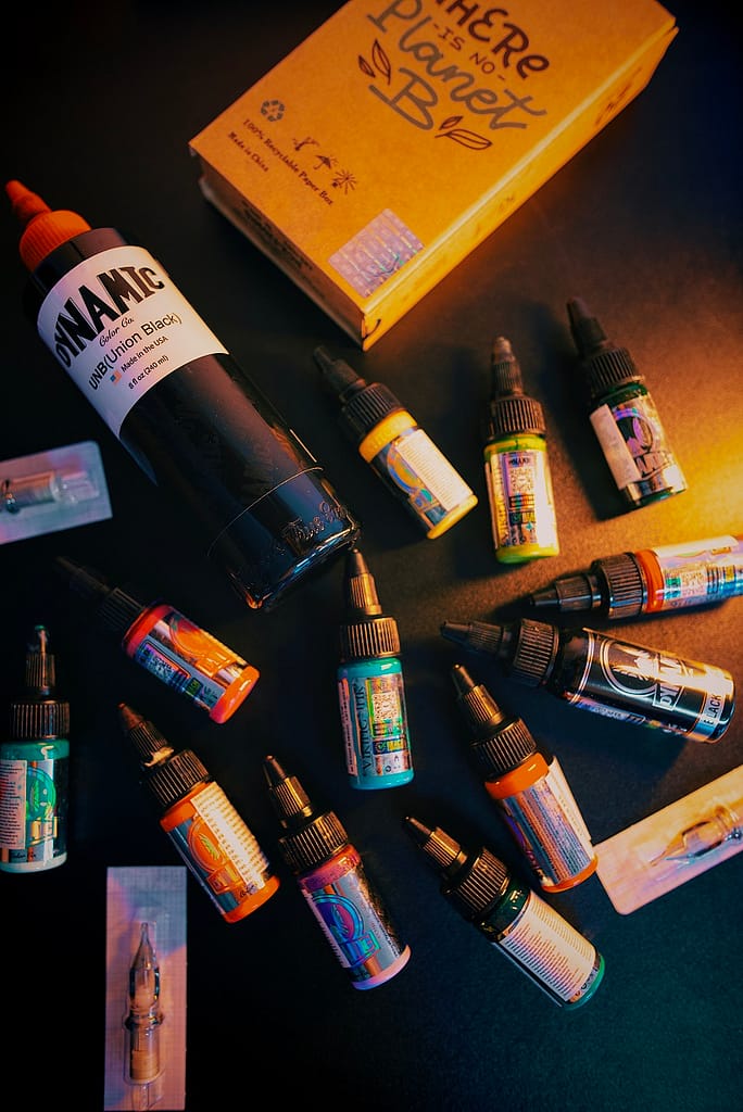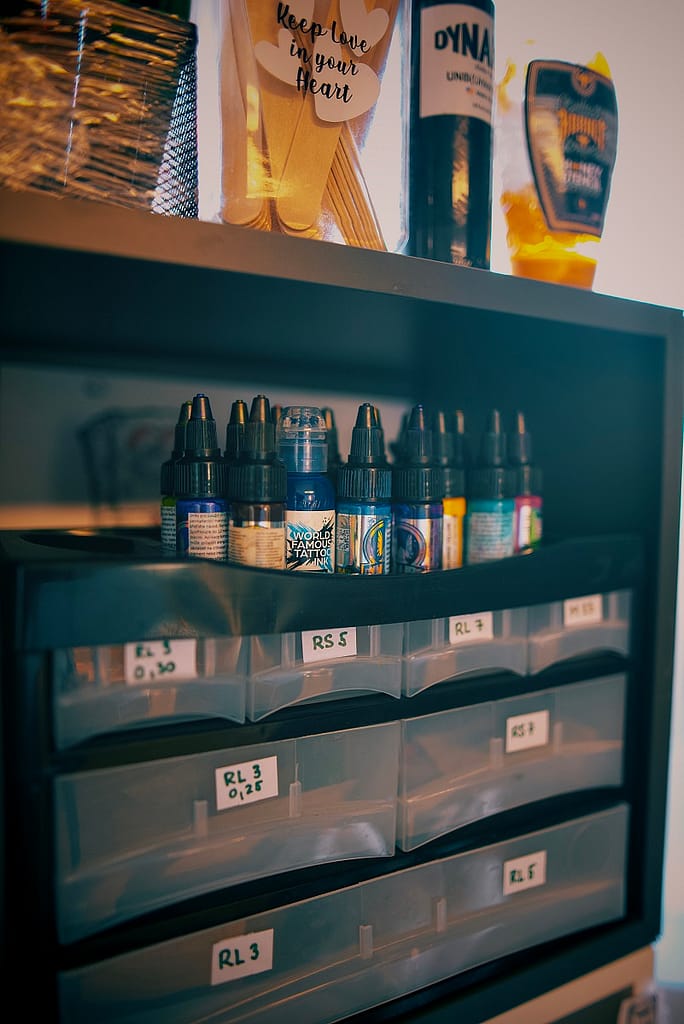 Na tetování používáme veganské barvy značek Dynamic, World Famous Ink, Eternal Ink, Panthera a další. Každé tetování provádíme sterilními jehlami a pomůckami certifikovanými na odborné provedení  tetováže.