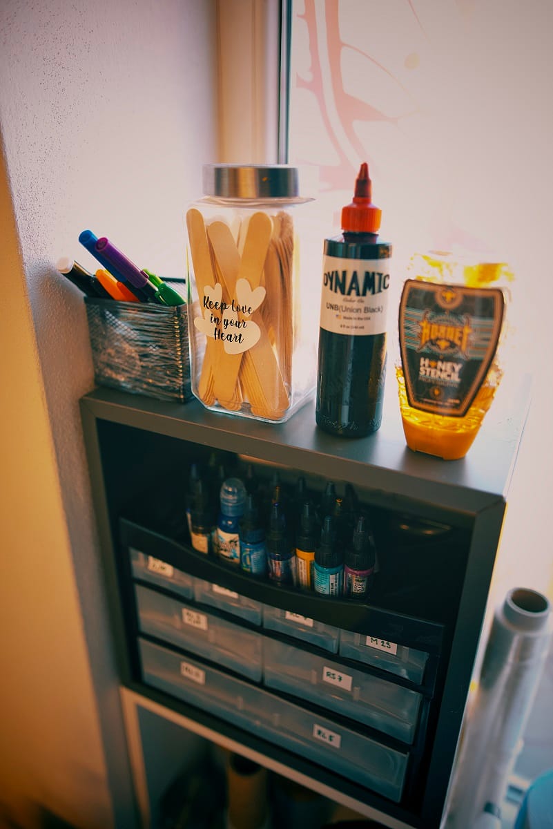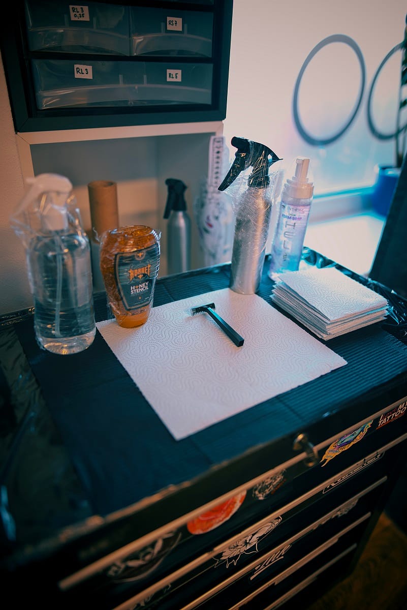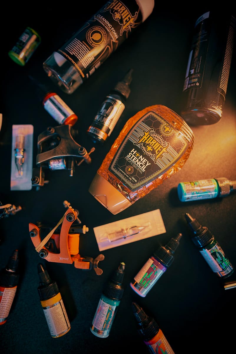 Na tetování používáme veganské barvy značek Dynamic, World Famous Ink, Eternal Ink, Panthera a další. Každé tetování provádíme sterilními jehlami a pomůckami certifikovanými na odborné provedení  tetováže.